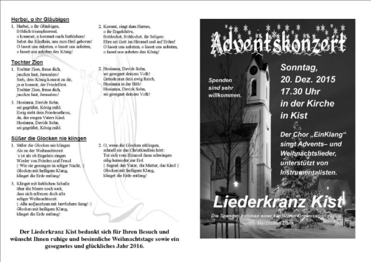 Seit Anfang Oktober schon wird geprobt, für das sechste Advents-/Weihnachtskonzert. Nun rückt der große Tag näher: Am Sonntag, 20. Dezember, singt der Chor „Ein-Klang“ des Liederkranzes Kist ab 17.30 Uhr Advents- und Weihnachtslieder, unterstützt von Instrumentalisten. Die musikalische Leitung hat Anni Loch-Karl.