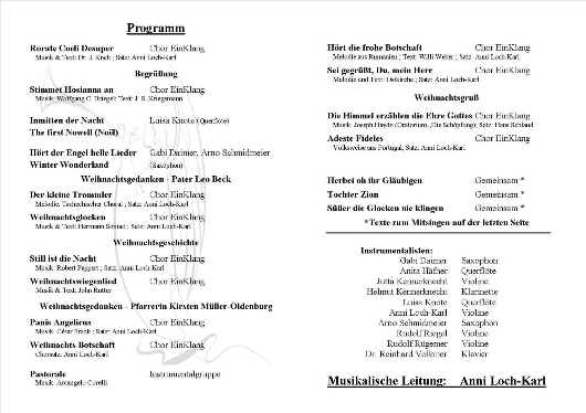 Die Weihnachtsgeschichte liest Sandra Hartwich. Auch die beiden Ortsgeistlichen Pfarrerin Kirsten Müller-Oldenburg und Pater Leo Beck werden an diesem Abend Gedanken zur Weihnacht beitragen.